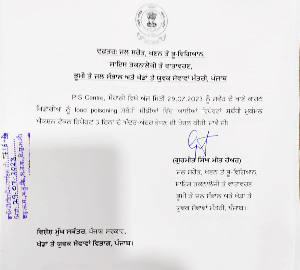 Following this, Punjab Sports Minister, Gurmeet Singh Meet Hayer, also reached the spot and took stock of the quality of food being served at the Punjab Institute of Sports in Phase-9 Sports Complex, Mohali.