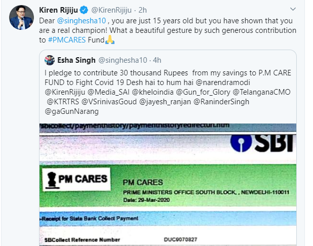 "Dear @singhesha10, you are just 15 years old but you have shown that you are a real champion! What a beautiful gesture by such generous contribution to #PMCARES Fund," Rijiju tweeted.