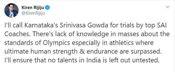 "I'll call Karnataka's Srinivasa Gowda for trials by top SAI Coaches. There's lack of knowledge in masses about the standards of Olympics especially in athletics where ultimate human strength & endurance are surpassed. I'll ensure that no talents in India is left out untested," Union Sports and Youth Affairs Minister Kiren Rijiju wrote on Twitter.