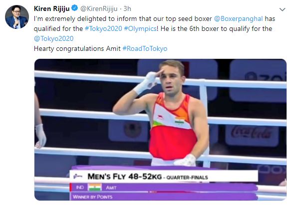 Rijiju took to twitter and posted Panghal's picture. He captioned the post, " I'm extremely delighted to inform that our top seed boxer @Boxerpanghal has qualified for the #Tokyo2020 #Olympics! He is the 6th boxer to qualify for the @Tokyo2020 Hearty congratulations Amit #RoadToTokyo."