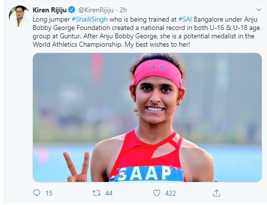 "Long jumper #ShailiSingh who is being trained at #SAI Bangalore under Anju Bobby George Foundation created a national record in both U-16 & U-18 age group at Guntur. After Anju Bobby George, she is a potential medalist in the World Athletics Championship. My best wishes to her!," Rijiju tweeted.