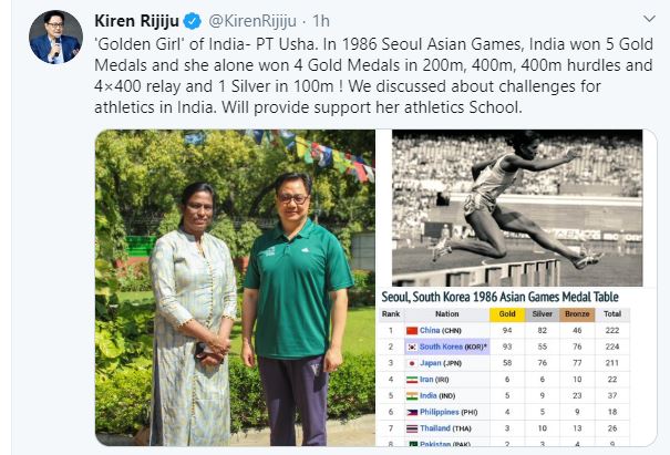 "'Golden Girl' of India- PT Usha. In 1986 Seoul Asian Games, India won 5 Gold Medals and she alone won 4 Gold Medals in 200m, 400m, 400m hurdles and 4x400 relay and 1 Silver in 100m ! We discussed about challenges for athletics in India. Will provide support her athletics School," Rijiju tweeted.
