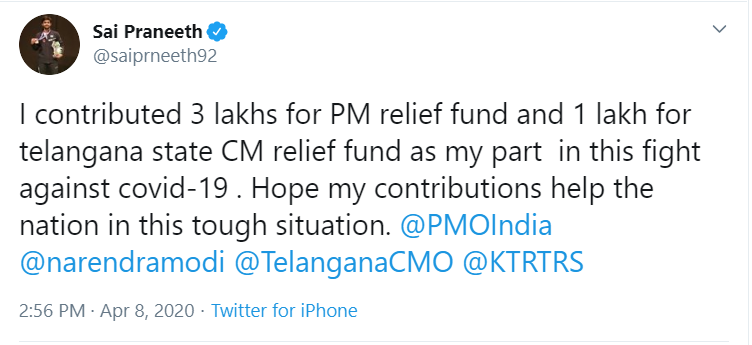 "I contributed 3 lakhs for PM relief fund and 1 lakh for telangana state CM relief fund as my part in this fight against covid-19 . Hope my contributions help the nation in this tough situation. @PMOIndia @narendramodi @TelanganaCMO @KTRTRS," Praneeth tweeted.