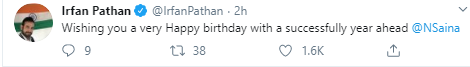 "Wishing you a very Happy birthday with a successfully year ahead @NSaina," Irfan tweeted.