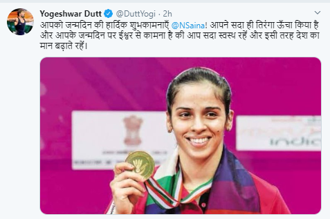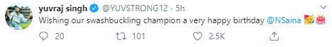 "Wishing our swashbuckling champion a very happy birthday @NSaina," Yuvraj tweeted.