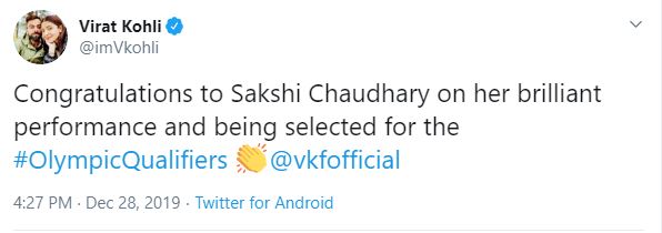 Taking to Twitter Kohli wrote, "Congratulations to Sakshi Chaudhary on her brilliant performance and being selected for the #OlympicQualifiers @vkfofficial."