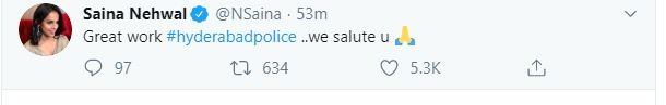 "Great work #hyderabadpolice ..we salute u," Nehwal tweeted.