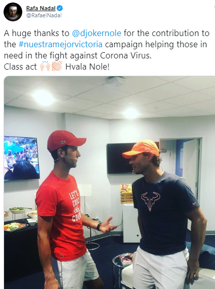 "A huge thanks to @djokernole for the contribution to the #nuestramejorvictoria campaign helping those in need in the fight against Corona Virus. Class act Hvala Nole!," Nadal tweeted.