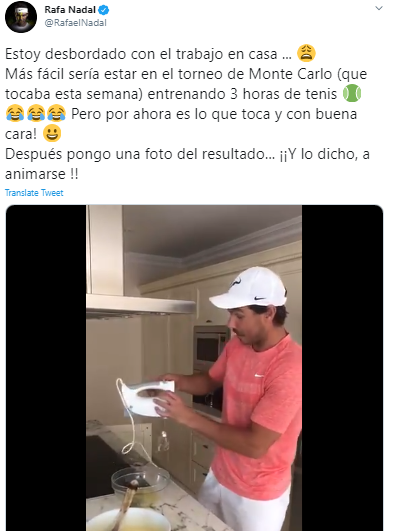 "I'm overwhelmed with work at home, It would be easier to be in the Monte Carlo tournament (which was playing this week) training 3 hours of tennis but for now it is what he plays and with a good face! Then I put a photo of the result ... And what was said, to cheer up !!" Nadal tweeted in Spanish.