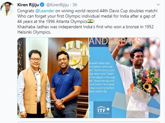 "Congrats @Leander on wining world record 44th Davis Cup doubles match! Who can forget your first Olympic individual medal for India after a gap of 44 years at the 1996 Atlanta Olympics!