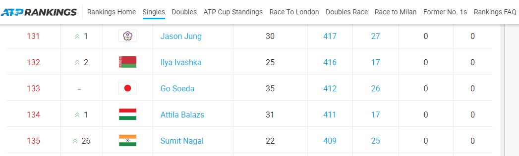 London [UK], Sept 30 (ANI): With a big jump of 26 places, Indian tennis star Sumit Nagal on Monday achieved his career-best ranking after moving up to the 135th position in the latest ATP rankings.