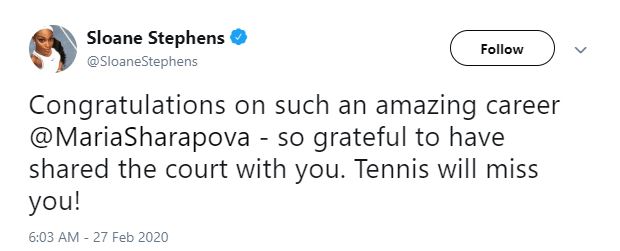 The 2017 US Open champion took to Twitter and wrote: "Congratulations on such an amazing career @MariaSharapova - so grateful to have shared the court with you. Tennis will miss you!"
