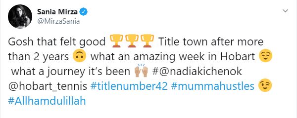 "Gosh that felt good Title town after more than 2 years what an amazing week in Hobart what a journey it's been #@nadiakichenok @hobart_tennis #titlenumber42 #mummahustles #Allhamdulillah," Mirza tweeted.