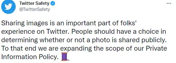 "Sharing images is an important part of folks' experience on Twitter. People should have a choice in determining whether or not a photo is shared publicly. To that end we are expanding the scope of our Private Information Policy. Beginning today, we will not allow the sharing of private media, such as images or videos of private individuals without their consent. Publishing people's private info is also prohibited under the policy, as is threatening or incentivizing others to do so," the post read.