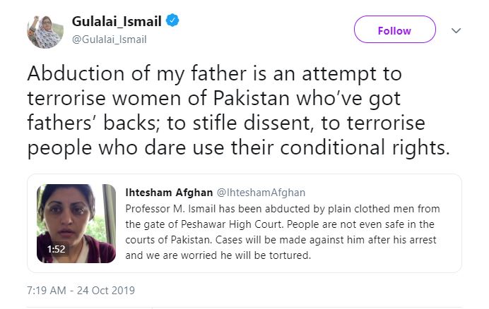 "Abduction of my father is an attempt to terrorise women of Pakistan who've got fathers' backs; to stifle dissent, to terrorise people who dare use their conditional rights," Ismail tweeted.