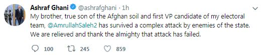 "My brother, true son of the Afghan soil and first VP candidate of my electoral team, @AmrullahSaleh2 has survived a complex attack by enemies of the state. We are relieved and thank the almighty that attack has failed," Afghanistan President Ashraf Ghani wrote on Twitter.