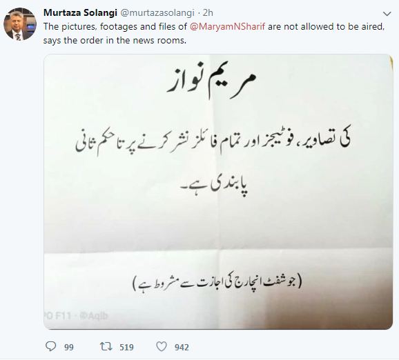 "The pictures, footages, and files of [?]@MaryamNSharif[?] are not allowed to be aired, says the order in the newsrooms," the tweet read.