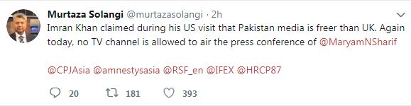 Senior Pakistani journalist Murtaza Solangi took to his official twitter handle, alleging that no TV channel was allowed to air the press conference. The journalist attached the image of a notice displayed in a newsroom, which read that any image, video, or file of Nawaz Sharif would not be allowed to be aired.