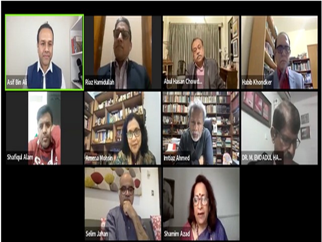 Dr Selim Jahan, former Director of the Human Development Report Office (HDRO) of the United Nations Development Programme (UNDP), New York; Dr Habibul Haque Khondker, Professor at the Department of Humanities and Social Sciences at Zayed University, Abu Dhabi, UAE; Professor Imtiaz Ahmed, Director, Centre for Genocide Studies, the University of Dhaka; Professor Amena Mohsin, Department of International Relations, the University of Dhaka; Dr M Emdadul Haq, Professor & Chair, Department of History and Philosophy, North South University, Dhaka; Shafiqul Alam, Dhaka Bureau Chief, AFP and Shamim Azad, Bangladeshi-born British bilingual poet, storyteller and writer, were panellists of the discussion program.