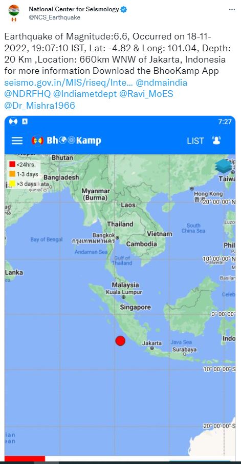 Jakarta [Indonesia], November 18 (ANI): An earthquake with a magnitude of 6.6 on the Richter scale struck 660km WNW of Jakarta, Indonesia on Friday, the National Centre for Seismology (NCS) said.