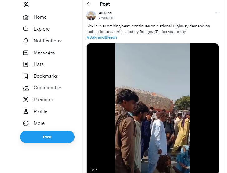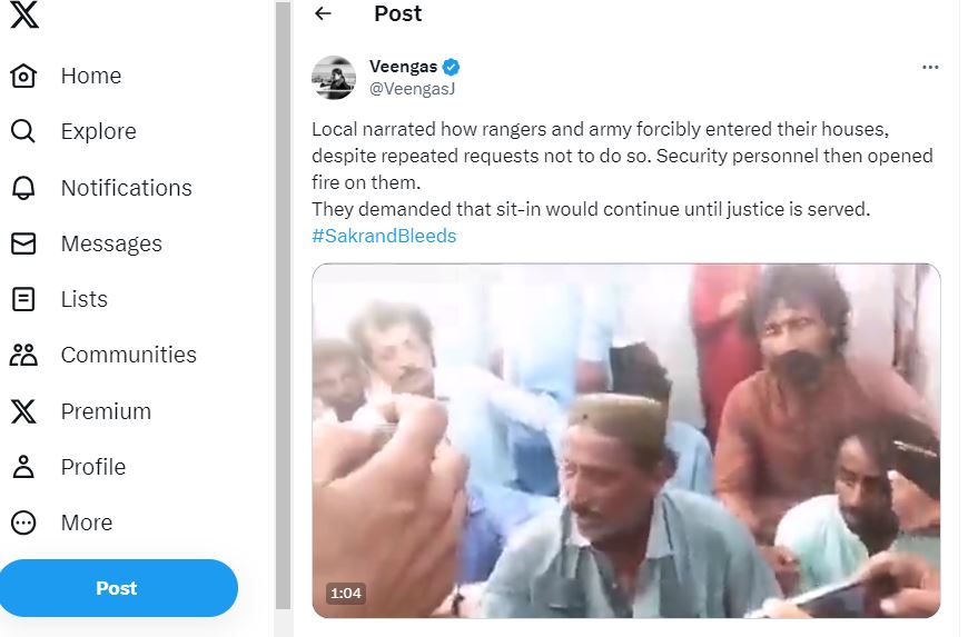 "Local narrated how rangers and army forcibly entered their houses, despite repeated requests not to do so. Security personnel then opened fire on them. They demanded that the sit-in would continue until justice is served, a social media user posted on X.