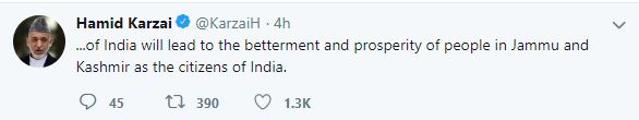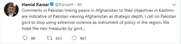 "Comments in Pakistan linking peace in Afghanistan to their objectives in Kashmir are indicative of Pakistan viewing Afghanistan as strategic depth. I call on Pakistan govt to stop using extremist violence as an instrument of policy in the region. We hope the new measures by govt ..of India will lead to the betterment and prosperity of people in Jammu and Kashmir as the citizens of India," Karzai said in a series of tweets.