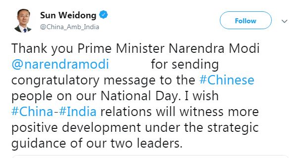 "Thank you Prime Minister Narendra Modi @narendramodi for sending congratulatory message to the #Chinese people on our National Day. I wish #China-#India relations will witness more positive development under the strategic guidance of our two leaders," Weidong wrote on Twitter.