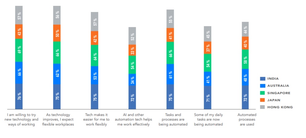 76 per cent of Indians say that they are willing to try new technologies and ways of working in order to be more efficient or productive is ahead of Singapore at 69 per cent. Both are ahead of the global average.