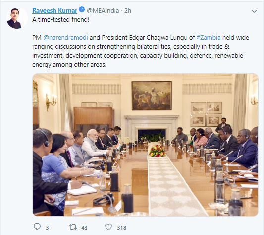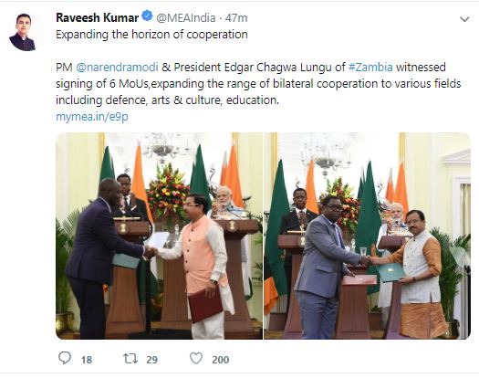 "Expanding the horizon of cooperation. PM @narendramodi & President Edgar Chagwa Lungu of #Zambia witnessed the signing of 6 MoUs, expanding the range of bilateral cooperation to various fields including defence, arts & culture, education," External Affairs Ministry Spokesperson Raveesh Kumar wrote on Twitter.