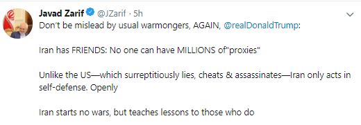 "Don't be mislead by usual warmongers, AGAIN, @realDonaldTrump: Iran has FRIENDS: No one can have MILLIONS of "proxies" Unlike the US--which surreptitiously lies, cheats & assassinates--Iran only acts in self-defense. Openly Iran starts no wars, but teaches lessons to those who do," tweeted Iranian Foreign Minister.