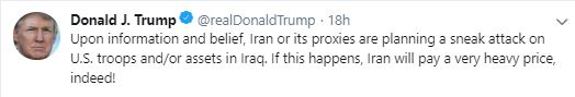 "Upon information and belief, Iran or its proxies are planning a sneak attack on U.S. troops and/or assets in Iraq. If this happens, Iran will pay a very heavy price, indeed!" Trump had tweeted.