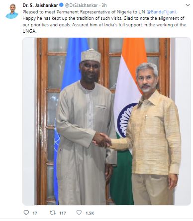 "Pleased to meet Permanent Representative of Nigeria to UN @BandeTijjani. Happy he has kept up the tradition of such visits. Glad to note the alignment of our priorities and goals. Assured him of India's full support in the working of the UNGA," Jaishankar wrote on Twitter.