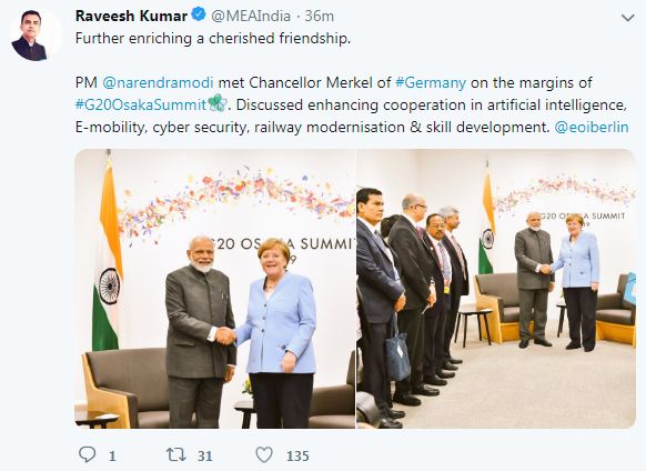 "Further enriching a cherished friendship. PM @narendramodi met Chancellor Merkel of #Germany on the margins of #G20OsakaSummit. Discussed enhancing cooperation in artificial intelligence, E-mobility, cybersecurity, railway modernisation & skill development," tweeted Ministry of External Affairs spokesperson, Raveesh Kumar.