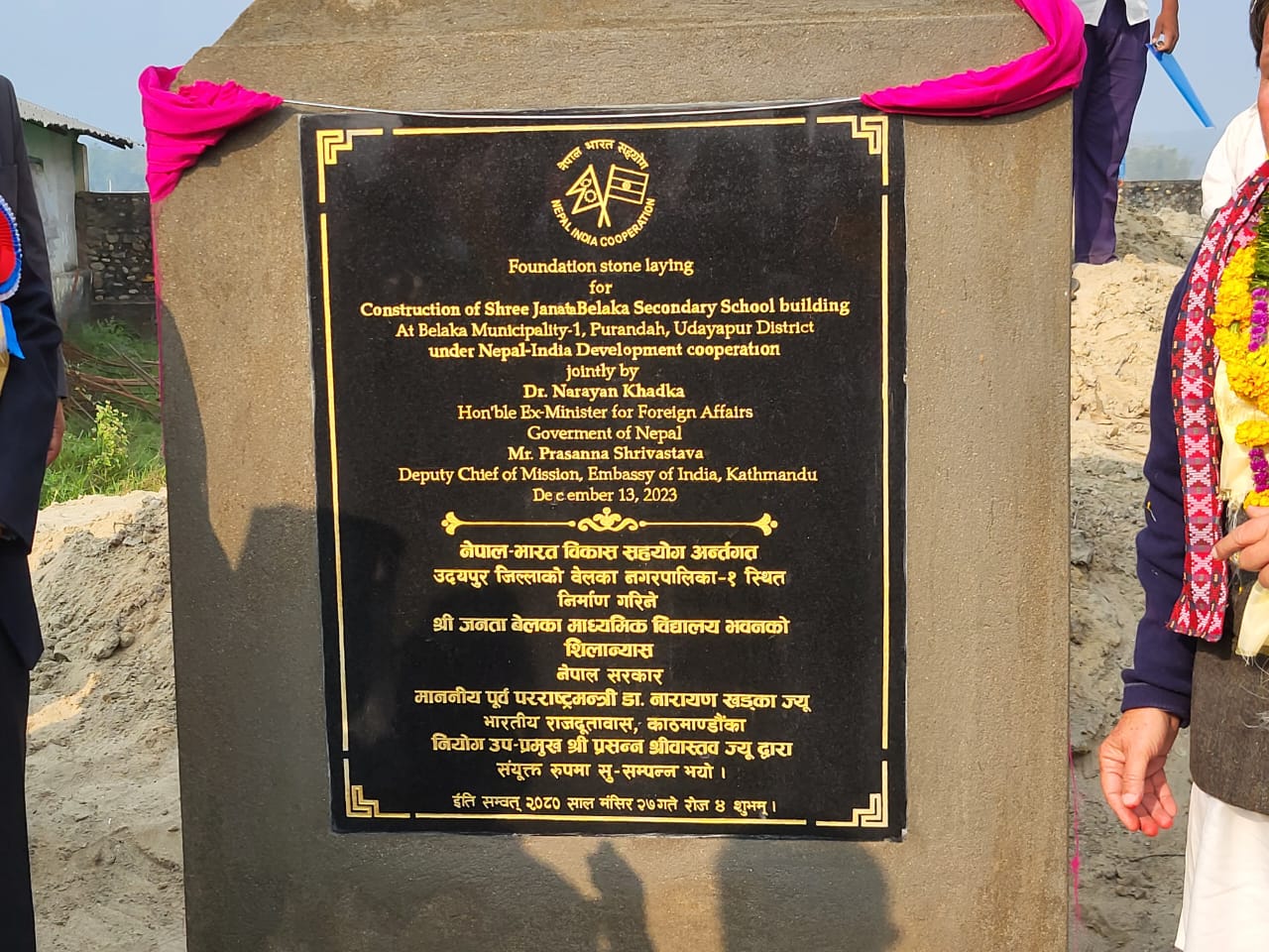 The release read further: "The Government of India grant under 'Nepal-India Development Cooperation' will be utilised for the construction of a triple-story school building with the required class rooms and other infrastructure facilities for this school. The project is being undertaken as a High Impact Community Development Project (HICDP), earlier known as Small Development Projects, under an agreement between the Government of India and the Government of Nepal. This project is being implemented through the Belaka Municipality, Udayapur."