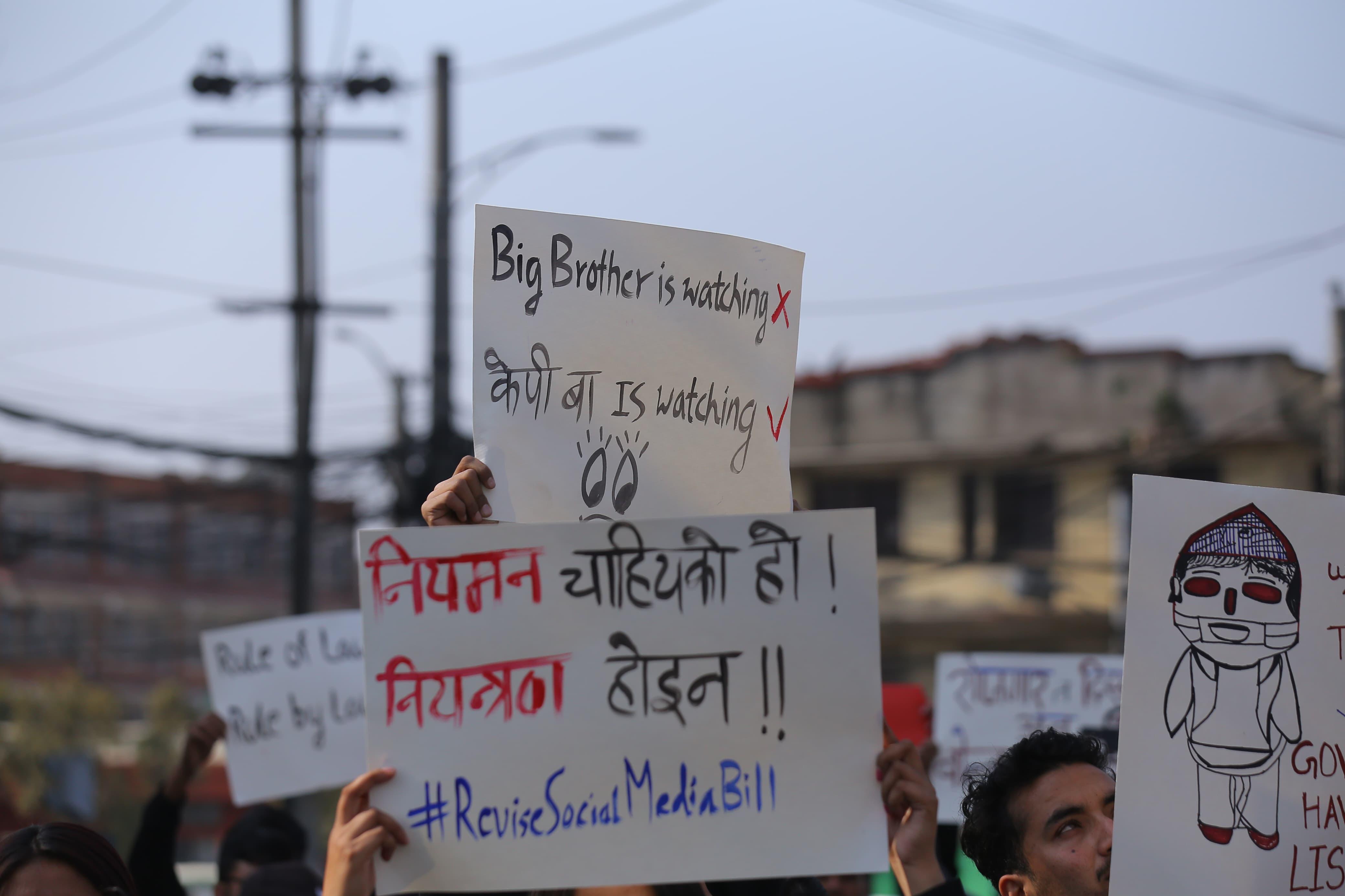 The protestors held placards that read, "One star of Congress is missing", "Dear KP Ba, can't we speak in a prosperous Nepal?", "Regulation is necessary, not control", among others.