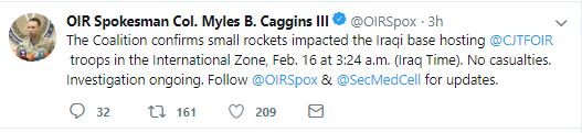 "The Coalition confirms small rockets impacted the Iraqi base hosting @CJTFOIR troops in the International Zone, February 16 at 3:24 am (Iraq Time). No casualties. Investigation ongoing," Caggins said on Twitter.