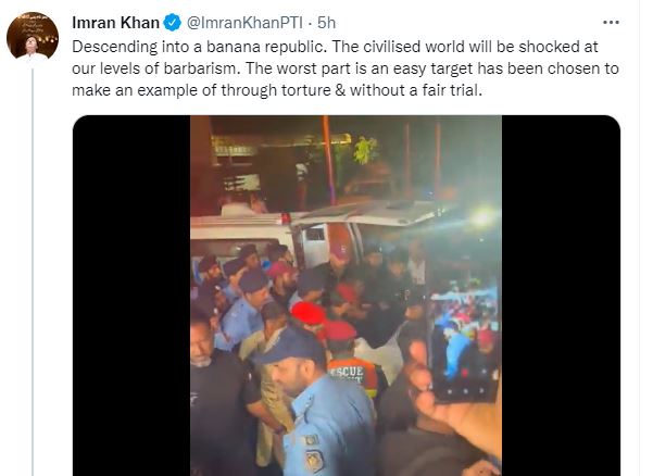 "Descending into a banana republic. The civilised world will be shocked at our levels of barbarism. The worst part is an easy target has been chosen to make an example of through torture and without a fair trial," Imran Khan tweeted along with the video of Gill being taken to hospital.