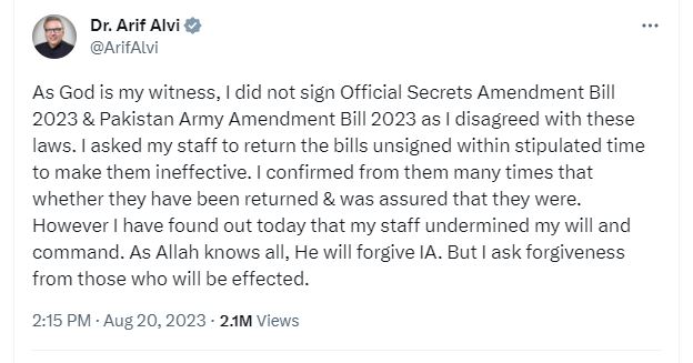 "As God is my witness, I did not sign Official Secrets Amendment Bill 2023 & Pakistan Army Amendment Bill 2023 as I disagreed with these laws. I asked my staff to return the bills unsigned within stipulated time to make them ineffective. I confirmed from them many times that whether they have been returned & was assured that they were. However I have found out today that my staff undermined my will and command. As Allah knows all, He will forgive IA. But I ask forgiveness from those who will be affected," Pakistan President Arif Alvi wrote on X, formerly known as Twitter.
