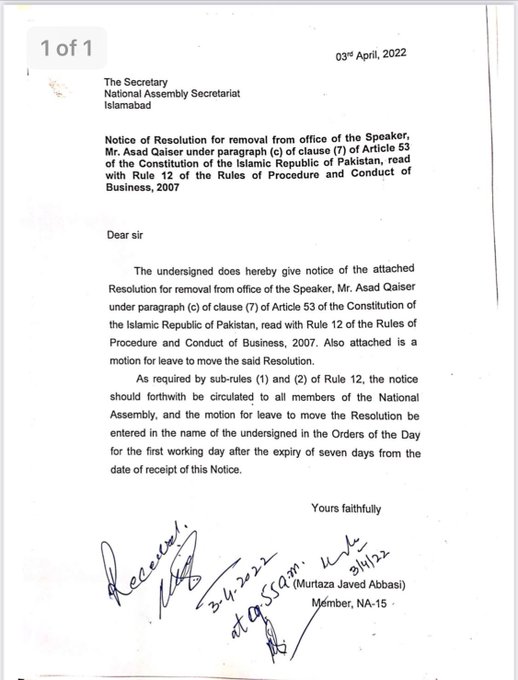 Pakistan Opposition parties submit no-confidence motion against National Assembly speaker Asad Qaisar
