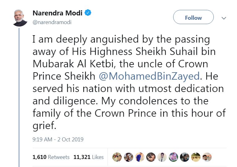 Modi said that Al Ketbi served his nation with utmost dedication and diligence. "My condolences to the family of the Crown Prince in this hour of grief," he said.