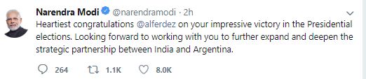"Heartiest congratulations @alferdez on your impressive victory in the Presidential elections. Looking forward to working with you to further expand and deepen the strategic partnership between India and Argentina," Modi wrote on Twitter.