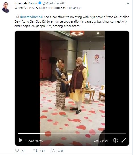 "When Act East & Neighborhood First converge PM @narendramodi had a constructive meeting with Myanmar's State Counsellor Daw Aung San Suu Kyi to enhance cooperation in capacity building, connectivity and people-to-people ties, among other areas," External Affairs Ministry spokesperson Raveesh Kumar wrote on Twitter.