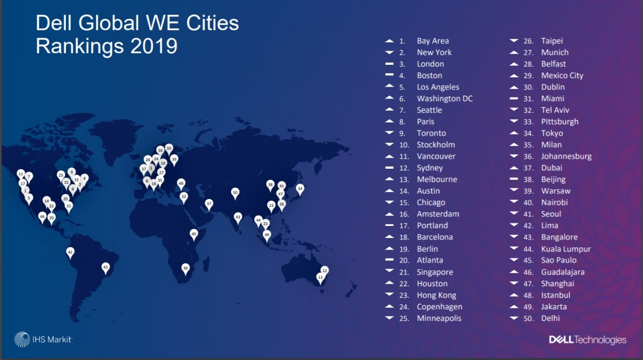 In the study sponsored by Dell and conducted by London-based global information provider, IHS Markit, San Francisco Bay Area emerged the top city overtaking its Eastern seaboard rival, New York to claim first place from the second place it gained in 2017 when the survey was last conducted. It scored 63.7 points, marginally above the 62.9 set by New York in 2017. The medium score across the 50 cities in 2019 was 40.3compared with 39.3in 2017.