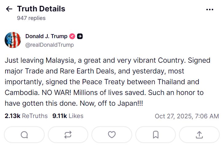 Taking to Truth Social, Trump wrote, "Just leaving Malaysia, a great and very vibrant Country. Signed major Trade and Rare Earth Deals, and yesterday, most importantly, signed the Peace Treaty between Thailand and Cambodia. NO WAR! Millions of lives saved. Such an honor to have gotten this done. Now, off to Japan!!!"