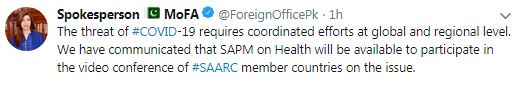 Pakistan Foreign Ministry spokesperson Aisha Farooqui tweeted on late Friday that Special Assistant to Prime Minister Imran Khan (SAPM) on Health, Zafar Mirza, will be available for the conference as coronavirus requires coordinated efforts at the global and regional level.