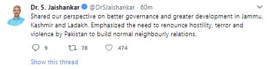 "Shared our perspective on better governance and greater development in Jammu, Kashmir and Ladakh. Emphasized the need to renounce hostility, terror and violence by Pakistan to build normal neighbourly relations,' he added.