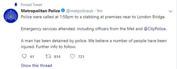 "Police were called at 1:58 pm to a stabbing at premises near to London Bridge. Emergency services attended, including officers from the Met and @CityPolice. A man has been detained by police. We believe a number of people have been injured. Further info to follow, Metropolitan Police wrote on Twitter.