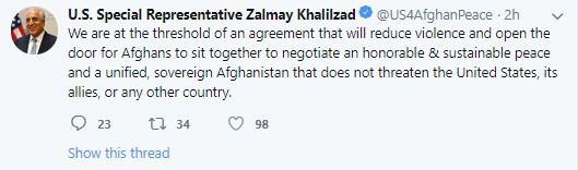 "We are at the threshold of an agreement that will reduce violence and open the door for Afghans to sit together to negotiate an honourable & sustainable peace and a unified, sovereign Afghanistan that does not threaten the United States, its allies, or any other country," Khalilzad wrote on Twitter.