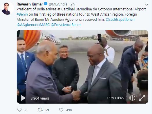 Kovind arrived at the Cardinal Bernadine de Cotonou International Airport here and was received by Benin's Foreign Minister Aurelien Agbenonci, External Affairs Ministry Spokesperson Raveesh Kumar wrote on Twitter.