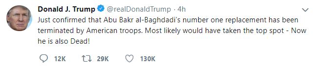 "Just confirmed that Abu Bakr al-Baghdadi's number one replacement has been terminated by American troops. Most likely would have taken the top spot - Now he is also Dead!" Trump tweeted.